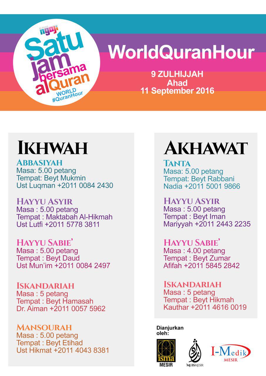 Kempen ini juga telah dilaksanakan oleh seluruh cawangan Isma di seluruh negara mahupun di luar negara termasuk di Mesir. Aktiviti bacaan Al-Quran sempena kempen World Quran Hour pada hari ini mengumpulkan sejumlah masyarakat pelajar di setiap muhafazah di Mesir untuk bersama-sama membaca Al-Quran secara berjemaah dan mengambil sebanyak mungkin manfaat darinya. Syukbah Isma Mesir yang terlibat menjayakan kempen ini adalah syukbah Madinah Nasr, Hayyu Sabie’, Mansurah, Tanta, Sayyeda-Abbasiah dan Iskandariah. Tambahan pula, hari ini 9 Zulhijjah merupakan Hari Arafah di mana Allah mengampunkan dosa-dosa setahun yang lalu dan setahun yang akan datang bagi mereka yang berpuasa pada hari tersebut.
